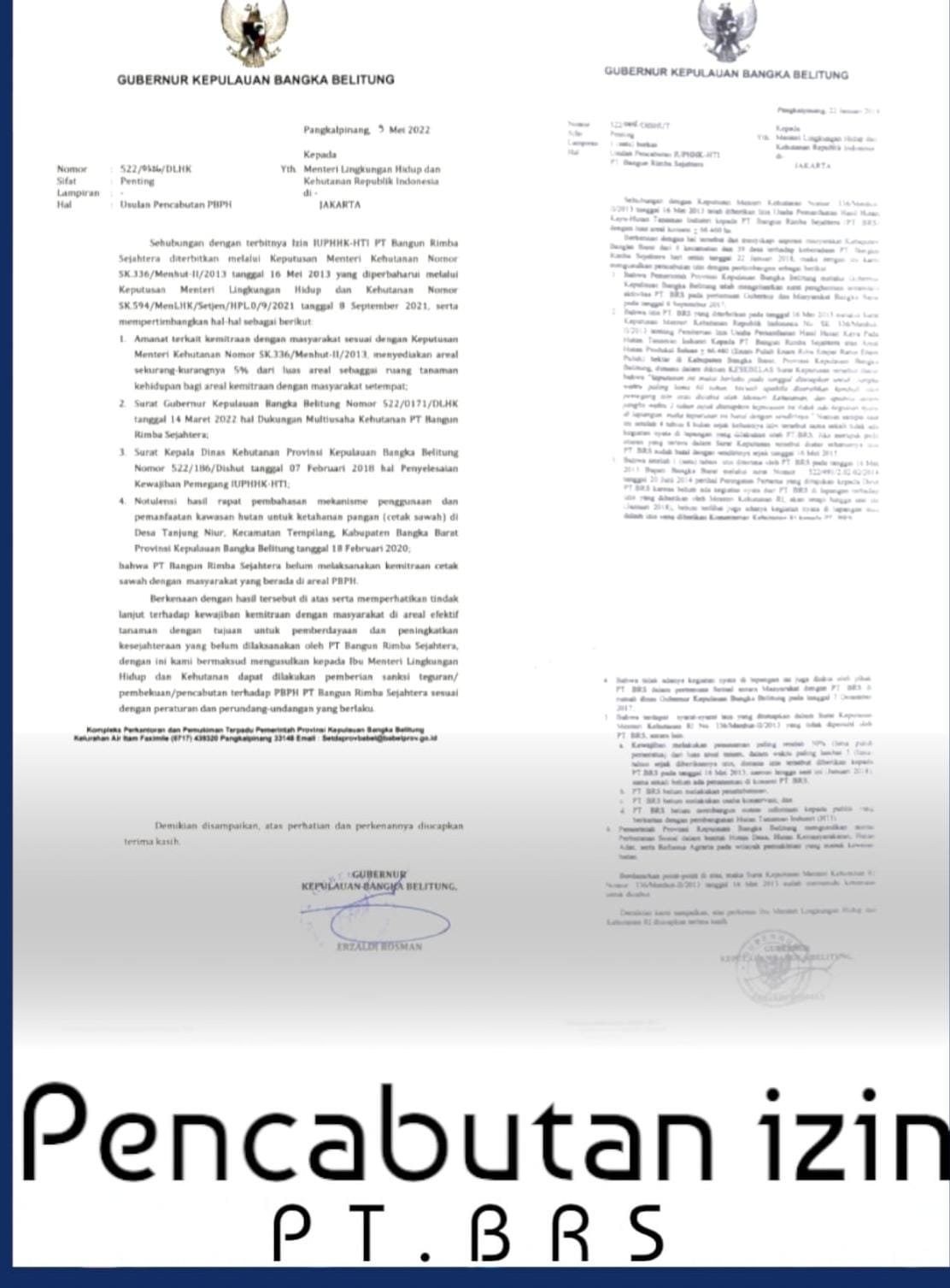 Adapun surat usulan pencabutan itu yang pertama, dengan nomor : 522/0326/DLHK, Pangkalpinang pada tanggal 09 Mei 2022, yang ditandatangani langsung oleh Gubernur Erzaldi Rosman Djohan dan ditujukan ke Menteri Lingkungan Hidup dan Kehutanan Republik Indonesia.